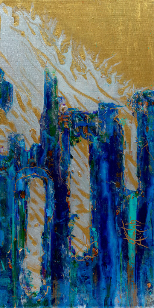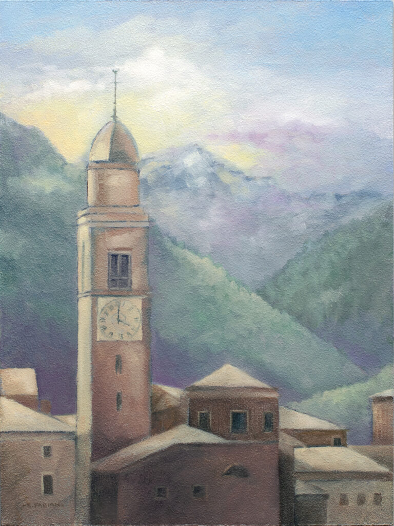 Created by artist, Elaine Soltis, “Aosta Ruins” was also created as part of the campaign to raise funds for the production. This original hands in the Municipio of the Comune di Aosta (the Town Hall in Aosta, Italy).